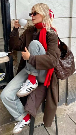 For a more everyday look, the red pops up in smaller details. I’m loving the combo of red socks, a red scarf, and a red hair bow. Pair these with your favorite sneakers, a classic pair of jeans, and an overcoat for that effortless, casual vibe. My go-to bag for this look is the CBNY Mail Bag—practical yet chic, it fits everything you need for those busy days on the go.